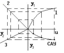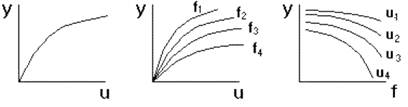 Режим работы САУ, в котором управляемая величина и все промежуточные величины не изменяются во времени, называется установившимся, или статическим режимом. Любое звено и САУ в целом в данном режиме описывается уравнениями статики вида y = F(u,f), в которых отсутствует время t. Соответствующие им графики называются статическими характеристиками. Статическая характеристика звена с одним входом u может быть представлена кривой y = F(u) (рис.11). Если звено имеет второй вход по возмущению f, то статическая характеристика задается семейством кривых y = F(u) при различных значениях f, или y = F(f) при различных u.