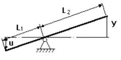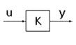 Так примером одного из функциональных звеньев системы регулирования воды в баке (см. выше) является обычный рычаг (рис.12). Уравнение статики для него имеет вид y = Ku. Его можно изобразить звеном, функцией которого является усиление (или ослабление) входного сигнала в K раз. Коэффициент K = y/u, равный отношению выходной величины к входной называется коэффициентом усиления звена. Когда входная и выходная величины имеют разную природу, его называют коэффициентом передачи.
