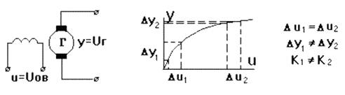 Звенья с линейными статическими характеристиками называются линейными. Статические характеристики реальных звеньев, как правило, нелинейны. Такие звенья называются нелинейными. Для них характерна зависимость коэффициента передачи от величины входного сигнала: K =