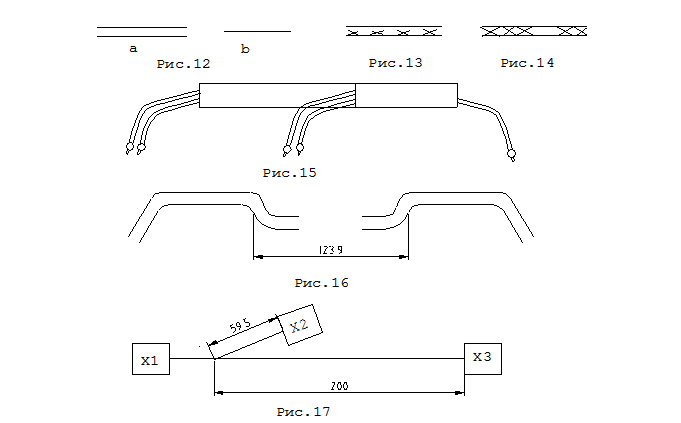 v На чертежах жгутов, кабелей, проводников отдельные проводники следует изображать упрощенно, т.е., внешними очертаниями (рис.12а) или условно, т.е., одной линией (рис.12б). При упрощенном изображении проводников допускается выделять их графически по примеру (рис.13). Экранированные проводники следует изображать упрощенно (рис.14).