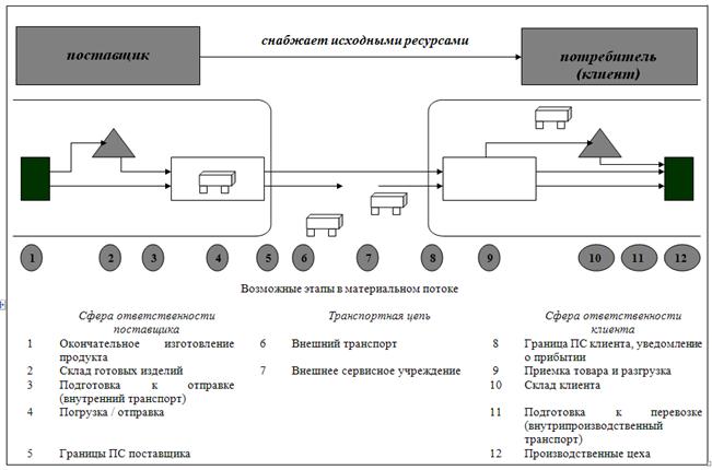 Д.И. Кокурин дает следующее определение материального потока «…физическое перемещение материальных ресурсов, определенных видов, в определенных количествах, понимаемое как процесс их движения на пути от определенного изготовителя до определенного потребителя и внутри предприятия – потребителя этих ресурсов из одного определенного места в другое в заранее оговоренные сроки».