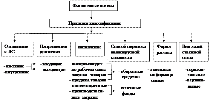 По видам хозяйственных связей различаются горизонтальные и вертикальные финансовые потоки. Первые отражают движение финансовых средств между равноправными субъектами предпринимательской деятельности, вторые — между дочерними и материнскими коммерческими организациями.