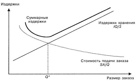 Расходы по хранению растут прямо пропорционально размеру заказа. Сложив оба графика, получим кривую отражающую суммарную зависимость расходов от размера заказываемой партии. Оптимальным станет тот размер заказа, которому будут соответствовать минимальные суммарные затраты на доставку и хранение продукции.