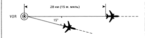 a) VOR: оба ВС находятся на радиалах, расходящихся под углом не менее 15°, и по крайней мере одно ВС находится на расстоянии 28 км (15м. миль) или более от этого средства;