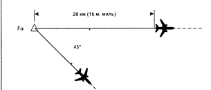 c) навигация методом счисления: оба воздушных судна находятся на линиях пути, расходящихся под углом не менее 45°, и по крайней мере одно воздушное судно находится на расстоянии 28 км (15 м. миль) или более от точки пересечения этих линий пути, причем эта точка определяется либо визуально, либо путем ориентирования с помощью навигационного средства, и оба воздушных судна удаляются от пересечения;