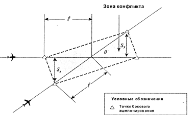 При пересекающихся линиях пути точки входа в зону и точки выхода из зоны, в которой боковое расстояние между линиями пути меньше требуемого минимума, называются точками бокового эшелонирования. Зона, ограниченная точками бокового эшелонирования, называется зоной конфликта. Боковое эшелонирование двух воздушных судов обеспечивается в том случае, когда по крайней мере одно из воздушных судов находится вне зоны конфликта.