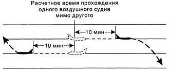 Там, где не обеспечивается боковое эшелонирование, обеспечивается вертикальное эшелонирование в течение по крайней мере 10 мин до и после расчетного времени, когда ВС должны пройти одно мимо другого, или расчетного времени, когда они прошли одно мимо другого. Если установлено, что ВС уже разошлись одно с другим, данный минимум применять не нужно.