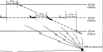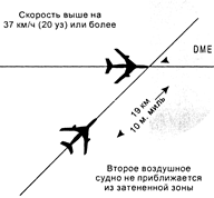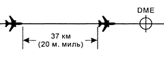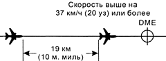 При использовании DME: Интервал 19 км (10 м. миль) между ВС в наборе, и ВС на той же линии пути. Между снижающимися ВС и ВС на той же линии пути.