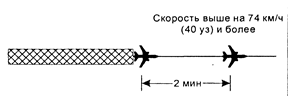 - 3 мин в случаях, перечисленных в подпункте с), при условии, что в каждом случае следующее впереди воздушное судно выдерживает истинную воздушную скорость, превышающую на 74 км/ч (40 уз) или более скорость следующего за ним воздушного судна
