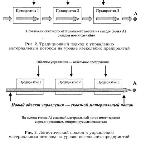 При логистическом подходе объектом управления выступает сквозной материальный поток (рис. 3). При этом обособленность предприятий — звеньев материалопроводящей цепи в значительной степени преодолевается с целью согласованного управления сквозным материальным потоком. Нужный груз начинает поступать в нужное место, в нужное время, в необходимом количестве, необходимого качества. Продвижение материального потока по всей цепи начинает осуществляться с минимальными затратами.