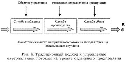 На микроуровне цепь, через которую последовательно проходит некоторый материальный поток, чаще всего состоит из различных служб одного предприятия (рис. 4). При традиционном подходе задача совершенствования сквозного материального потока внутри предприятия, как правило, не имеет приоритетного значения ни для одного из подразделений. Показатели материального потока на выходе из предприятия, так же как и в первом примере, имеют случайное значение и далеки от оптимальных.