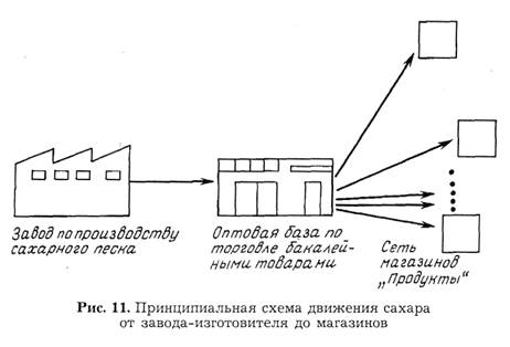 На рис. 11 изображены три категории участников товародвижения сахарного песка: завод, оптовая база и сеть продовольственных магазинов.