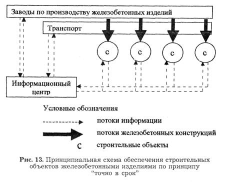 Рассмотрим принципиальную схему логистической организации потоков железобетонных конструкций с заводов на строительные объекты (рис. 13).