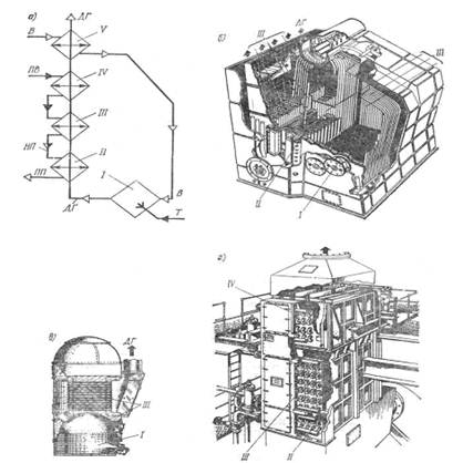 Принципиальная схема котла показана на рис. 1.1, а, общий вид котлов разных типов – на рис. 1.1, б, в, г. Паровой котел (ПК) состоит из топки I и ряда рекуперативных теплообменников, расположенных за топкой: пароперегревателя II, испарителя III, водоподогревателя (экономайзера) IV и воздухоподогревателя V. В этих теплообменниках горячая среда (дымовые газы) отделена от холодной (пар, вода, воздух) непроницаемой твердой стенкой, то есть среды, обменивающиеся теплотой, не смешиваются друг с другом.