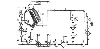 Отработавший в турбине ГТЗА 5 пар поступает в главный конденсатор 7, где конденсируется и насосом 8 в виде конденсата (воды) нагнетается в ППВ 10. Сюда же насосом 9 подается конденсат от вспомогательного конденсатора 6, а также греющий пар (стрелки на трубопроводах 11) от отборов турбины ГТЗА 5. Вода в ППВ 10 смешивается с паром и нагревается до температуры кипения. Растворенные в ней газы удаляются в атмосферу, то есть смесительный подогреватель 10 служит также деаэратором питательной воды. Из подогревателя-деаэратора 10 питательным насосом 12 вода нагнетается в паровой котел 1 (через ППВ 13 и 14, обогреваемые паром из отборов турбины ГТЗА 5). Здесь теплота, выделившаяся при сжигании органического топлива, передается от дымовых газов к воде и пару. Топливо в топку котла 1 подается из расходной цистерны 16 насосом 15 через фильтры 17 и подогреватель топлива 18. Туда же вентилятором 19 из атмосферы подается воздух, а образующиеся при сгорании топлива дымовые газы отводятся (стрелка 20) в дымовую трубу.