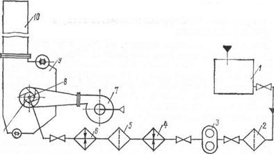 чей очистки топлива, подогреватели топлива 4, 6, шестеренчатый насос 3, забирающий топливо из расходной цистерны и подающий его через фильтры, подогреватели к топочным устройствам (форсункам) 8. Необходимый для сгорания топлива воздух подается в топку котла котельным вентилятором 7. Образующиеся при сгорании топлива дымовые газы, отдав теплоту в поверхностях нагрева котла 9, удаляются через газоход 10 в дымовую трубу.