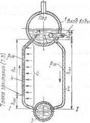 Рассмотрим работу простейшего контура циркуляции. Схема простейшего контура с естественной циркуляцией воды и пароводяной смеси приведена на рис. 4.4. Замкнутый циркуляционный контур состоит из двух рядов труб: левого ряда 4, обогреваемого теплотой
