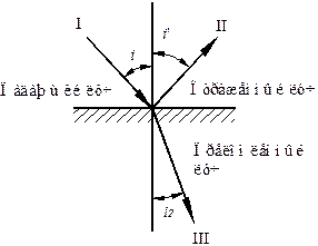 Закон отражения света: отраженный луч лежит в одной плоскости с падающим и перпендикуляром, проведенным к границе раздела сред в точке падения. При этом угол падения равен углу отражения (рис.1)