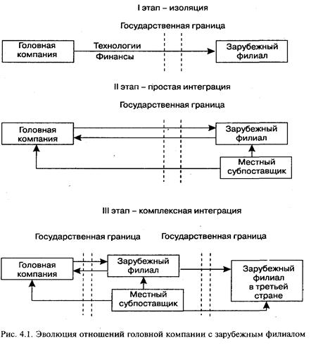 Обобщая опыт развития производственных и коммерческих взаимоотношений головных компаний с зарубежными дочерними фирмами, можно выделить три типичных этапа на пути становления зарубежного филиала ТНК в принимающей стране от первых шагов до глубокой интеграции этого филиала в деятельность всей системы предприятий международной компании (рис. 4.1).