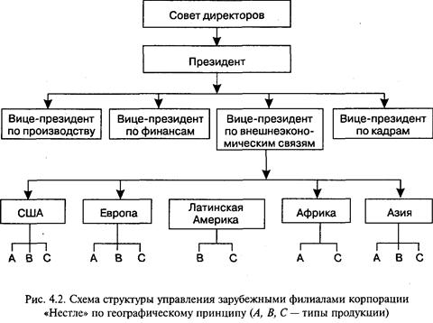 1. Организация руководства по географическим направлениям бизнеса, т.е. страновой подход. Этот принцип используется компаниями с недиверсифицированным ассортиментом товаров и услуг. Такая структура управления, в частности, позволяет швейцарской корпорации «Нестле» проводить единую техническую политику при производстве ограниченного ассортимента пищевых изделий по всему миру с учетом специфики национального спроса в принимающих странах (рис. 4.2).