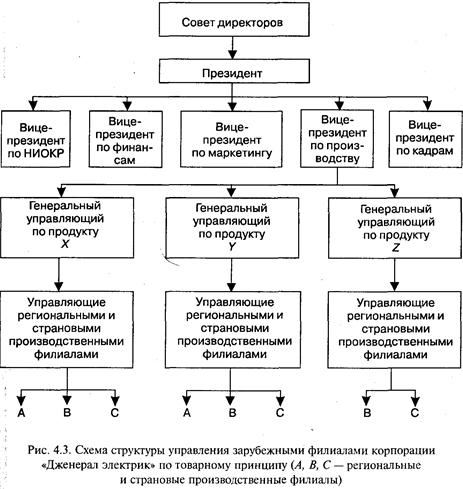 В подчинении генеральных управляющих находятся управляющие зарубежных региональных и страновых производственных филиалов, задача которых — адаптация товарного ассортимента, выпускаемого зарубежными филиалами, к условиям принимающих стран (рис. 4.3).