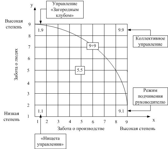 2) забота о людях (ось Y) – стремление руководителя к достижению конечных результатов на основе доверия и уважения работников, симпатии друг к другу, понимания и поддержки. Это создание благоприятных условий труда, ходатайство о повышении зарплаты, премирование и т.п.