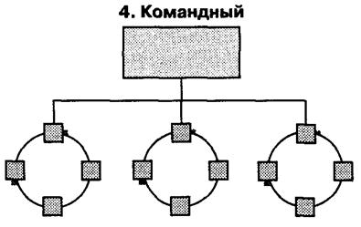 Принцип организации. Существуют две разновидности командного подхода в организациях. Многофункциональные команды включают сотрудников различных функциональных отделов, которые берут на себя ответственность за деятельность группы и совместно работающих над решением поставленных задач. Как правило, члены команды подотчетны «своим» функциональным отделам, но в то же время они отчитываются и перед группой. Один из них, как правило, выполняет функции непосредственного руководителя, лидера команды.