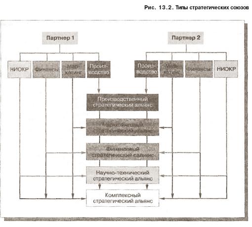 Как показано на рис. 13.2, сотрудничество между компаниями, входящими в состав стратегических альянсов, может развиваться по разным направлениям. Например, такое стратегическое сотрудничество может принимать форму комплексного альянса, в котором партнеры принимают участие во всех операциях, начиная от разработки нового продукта и заканчивая его изготовлением и маркетингом. Компании могут также сформировать стратегический альянс с более ограниченными функциями; усилия участников альянса в большинстве случаев сосредоточены только на одном элементе бизнеса, например — на выполнении научно- исследовательских и опытно-конструкторских работ (НИОКР). Глубина сотрудничества между участниками зависит от основных целей каждого из партнеров.
