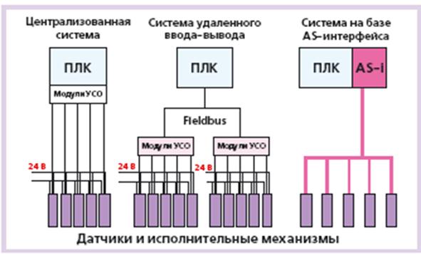 ● минимизация расходов на кабельную систему (рис. 3.1) в силу минимизации или полного исключения (для интеллектуальных датчиков) линий с аналоговыми сигналами, использования недорогого двухпроводного кабеля между ведущим и ведомыми устройствами, исключения отдельных кабелей электропитания оконечных устройств (датчиков и исполнительных механизмов);