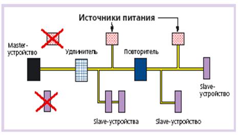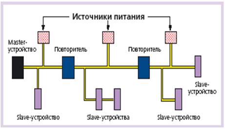 Рис. 3.3. Топология сети AS-интерфейса с двумя повторителями
