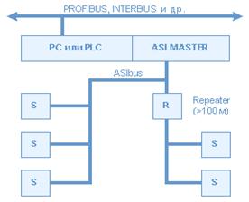Рис. 3.4. Топология сети AS-интерфейса с повторителем и удлинителем