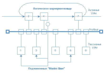 | Для удовлетворения требования детерминированного метода доступа к среде передачи с гарантированным временем реакции при построении даже простых систем управления в PROFIBUS комбинируется два метода доступа к среде передачи. Децентрализованному методу передачи маркера (принцип Token-Passing) может быть подчинен централизованный метод "Master-Slave". Поэтому в PROFIBUS различается два класса узлов. Активные узлы (Master) находятся в логическом кольце, в котором от узла к узлу циклически передается право доступа к шине маркером (рис. 5.1). Кроме того, каждый активный узел знает своих соседей (предшественника и последователя). Протокол поддерживает автоматическое включение и выключение активных узлов из логического кольца и обрабатывает ситуации ошибок (например: потерю маркера, ошибки передачи маркера и т.д.). Активный узел может обращаться к шине только в том случае, если у него есть маркер. Пассивные узлы не могут самостоятельно обращаться к шине, а только отвечают на запросы активных узлов, которые в данный момент обладают маркером. | ||