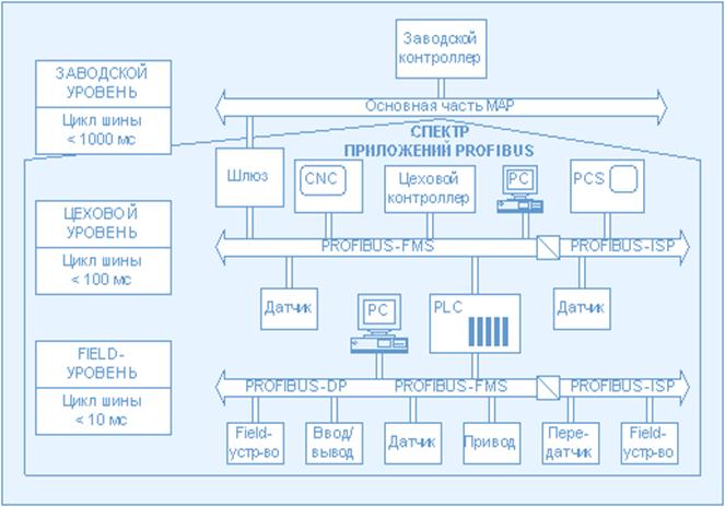 PROFIBUS - семейство ЦПС, обеспечивающее комплексное решение коммуникационных проблем предприятия. На нижнем уровне применяется сеть PROFIBUS - DP, обеспечивающая высокоскоростной обмен данными с оконечными устройствами. Протокол обмена данными гарантирует определенное время цикла опроса в зависимости от скорости обмена и числа узлов в сегменте что позволяет применять PROFIBUS в системах реального времени. На более высоком уровне применяется сеть PROFIBUS-FMS, ориентированная на обеспечение информационного обмена одноранговых устройств. Во взрывоопасных зонах используется сеть PROFIBUS-PA, основанная на стандарте физического уровня IEC 61158-2.