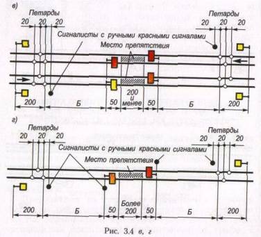 Схемы ограждения препятствий и мест производства работ на однопутном участке приведенынарис. 3.4, а, на одном из путей двухпутного участка — на рис. 3.4, б, на обоих путях двухпутного участка — на рис. 3.4, в.
