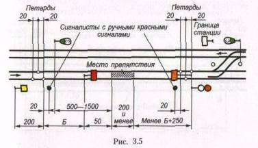 Если место препятствия или производства работ на перегоне находится вблизи станции и оградить это место в установленном порядке невозможно, то со стороны перегона оно ограждается так, как указано в настоящем пункте, а со стороны станции переносной красный сигнал устанавливается на оси пути против входного сигнала (или сигнального знака «Граница станции») с укладкой трех петард, охраняемых сигналистом (рис. 3.5). Если место препятствия или производства работ расположено на расстоянии менее 60 м от входного сигнала (или сигнального знака «Граница станции»), то петарды со стороны станции не укладываются. Схема ограждения препятствия перед входным сигналом приведена на рис. 3.5.