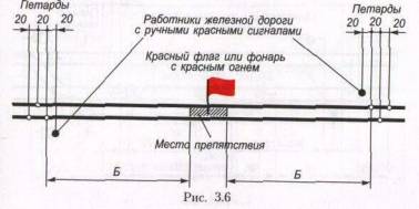3.5. При внезапном возникновении препятствия и отсутствии необходимых переносных сигналов следует немедленно на месте препятствия установить сигнал остановки (рис. 3.6): днем—красный флаг, ночью — фонарь с красным огнем и с обеих сторон на расстоянии Б, указанном в графе 4 табл. 3.1, в зависимости от руководящего спуска и максимальной допускаемой скорости движения поездов на перегоне уложить по три петарды.