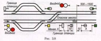 3.8. Если место, требующее уменьшения скорости на перегоне, расположено вблизи станции и оградить его в установленном порядке невозможно, то со стороны перегона оно ограждается так, как указано настоящем пункте, а со стороны станции — в порядке, указанном на рис. 3.8.