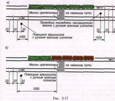 3.17. К ограждению хвоста и головы поезда, имеющего вынужденную остановку на перегоне, а также мест препятствий для движения поездов на смежном пути двухпутного или многопутного перегона по распоряжению машиниста ведущего локомотива могут быть привлечены работники локомотивной бригады, проводники пассажирских вагонов, кондукторы, а также работники других служб.