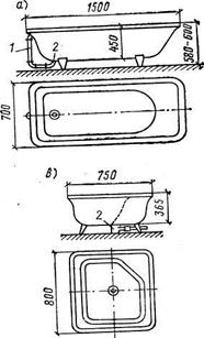 Ванны. В настоящее время промышленность выпускает ванны нескольких типовых размеров по ГОСТ 1154-80. Изготовляют ванны круглобортные и прямобортные шириной 700 и 750 мм, длиной 1500 и 1700 мм, глубиной 445 и 460 мм. Высота расположения борта ванны над полом 0, 6-0,65 м.