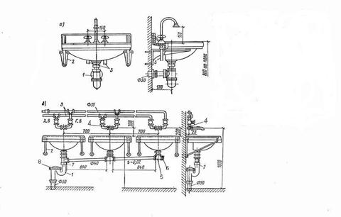 а - индивидуального; б - круглого группового для бытовых помещений промышленных зданий. 1- сифон; 2 - кронштейн; 3 - подводки горячей и холодной воды; 4 - смеситель; 5 - тройник; 6 - прочистка (пробки); 7- заделка выпуска; 8 - ревизия сифона.