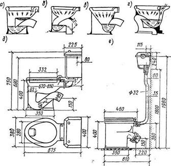 а, б - тарельчатый унитаз; в - воронкообразный смывной унитаз; г - установка тарельчатого унитаза «Компакт» с низкорасположенным бачком; е - установка унитаза с високорасположенным бачком.
