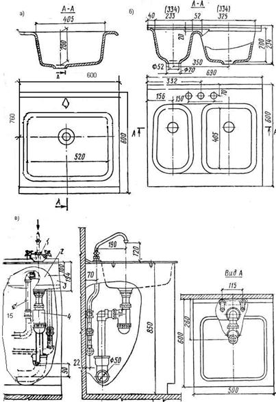 Мойки. Для мытья посуды и пищевых продуктов выпускают мойки(эмалированные) с одним или двумя отделениями (рис.. 5.5). Их выпускают из чугуна по ГОСТ 7506-83, а также из стали по ГОСТ 24843-81. Мойки оборудуют смесителем для холодной и горячей воды. Выпуски моек комплектуют сифоном с прочисткой.