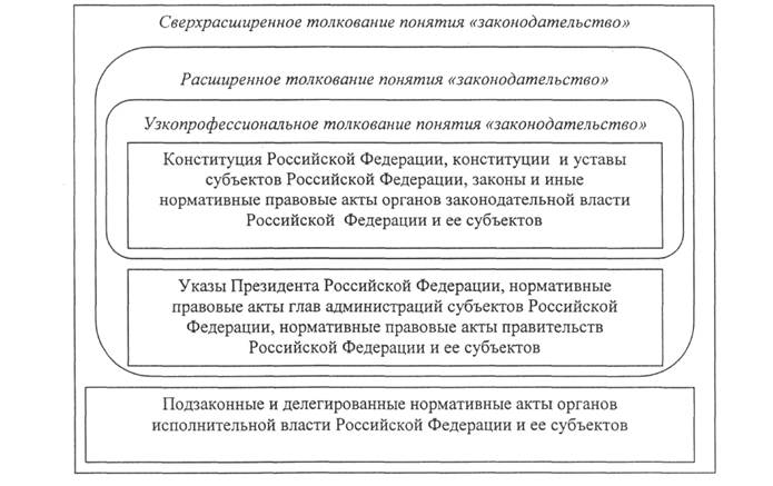 Очень часто в практической деятельности подзаконные и делегированные нормативные акты также включают в состав законодательства (рис. 1.2), что представляется не совсем верным с методической и терминологической точек зрения.