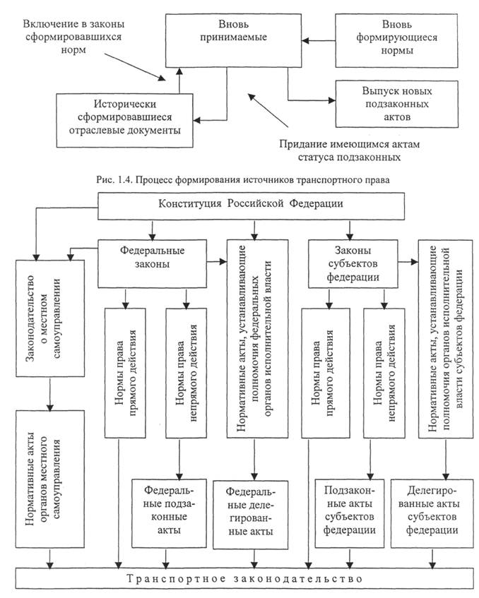 Особенностью процесса формирования современного транспортного права (как и иных комплексных отраслей права) является следование принципу «снизу вверх». Согласно этому принципу, устоявшиеся нормы права и традиции отраслевого управления, сформировавшиеся «внизу» (т.е. на уровне, который соответствует подзаконным и делегированным актам), поэтапно трансформируются «наверх», т.е. включаются в подготавливаемые и принимаемые законопроекты. Это объясняется тем, что транспортное право в предшествующий советский период развивалось преимущественно в форме выпуска отраслевых нормативных документов, издававшихся органами исполнительной власти. Вместе с тем, появление новых законов вызывает и процесс появления соответствующих подзаконных актов (рис. 1.4).