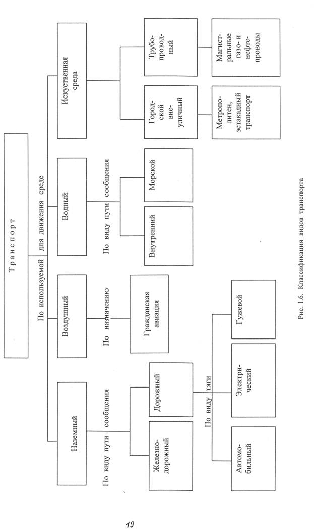 На практике сложилось технико-технологическое подразделение транспорта по видам в зависимости от используемых для перевозок среды, путей сообщения, подвижного состава, назначение транспорта (рис. 1.6).