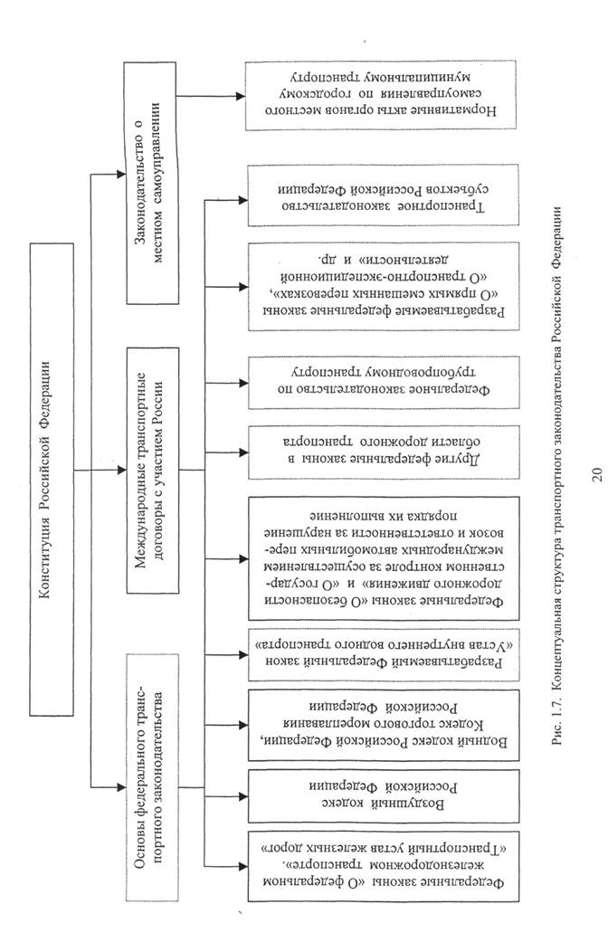 Обобщая сказанное, можно представить концептуальную структуру российского транспортного законодательства (рис. 1.7). В данной структуре отражены как действующие законы (сплошные линии), так и законодательные акты (штриховые линии), которые либо находятся на стадии разработки, либо целесообразны для введения в состав действующего российского законодательства.