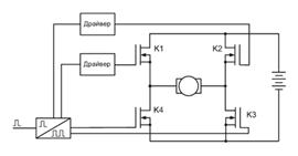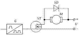 Т.е., ток через двигатель продолжает течь в прежнем направлении. Источником энергии для него служит магнитное поле индуктивности, а диод - замыкает цепь в паузе, когда транзистор закрыт.