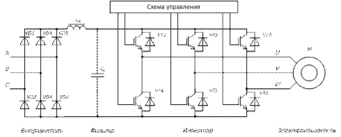 На рисунке 1.11 представлена схема частотного преобразователя. Транзисторы работают в ключевом режиме попарно (один верхний, другой нижний), открываясь с частой, задаваемой схемой управления. В схеме используется широтно-импульсное управление, позволяющее создать в обмотках статора электродвигателя синусоидальный ток необходимой частоты и амплитуды.