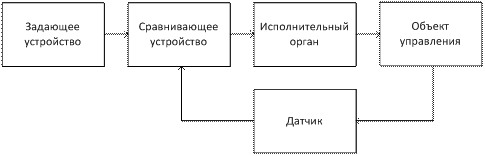 На рисунке 2.3 представлена общая структура системы автоматического регулирования. Задающее устройство устанавливает значение регулируемой величины. Далее происходит сравнение заданного и фактического (приходящего с датчика) значений. При наличии рассогласования исполнительный орган восстанавливает заданное значение регулируемой величины.
