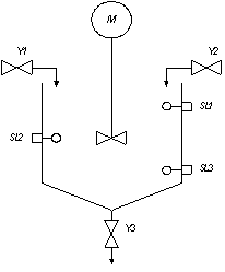 По команде запуска открыть вентиль Y1 и заполнить бак до отметки SL2. Закрыть вентиль Y1, открыть вентиль Y2 и заполнить бак до отметки SL1. Закрыть вентиль Y2 и на 15 минут включить смеситель. Открыть вентиль Y3 и слить полученную смесь. По сигналу датчика SL3 закрыть вентиль Y3 и привести схему в исходное состояние.